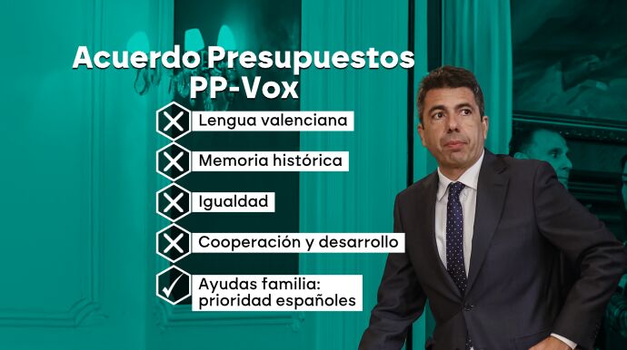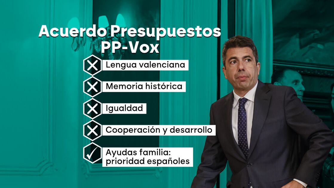 Carlos Mazón ha pactado con Vox para aprobar los Presupuestos autonómicos del próximo año, adoptando las principales propuestas de la ultraderecha en temas como cambio climático, migración y Memoria Histórica. Ha rechazado el Pacto Verde Europeo, eliminado partidas para la Agenda 2030 y recortado fondos para la promoción del valenciano y Memoria Histórica. Además, ha reducido subvenciones a sindicatos y organismos de igualdad, acordando el mayor recorte en cooperación de la Comunidad Valenciana. No destinarán fondos a la UNRWA y priorizarán deducciones fiscales para españoles.