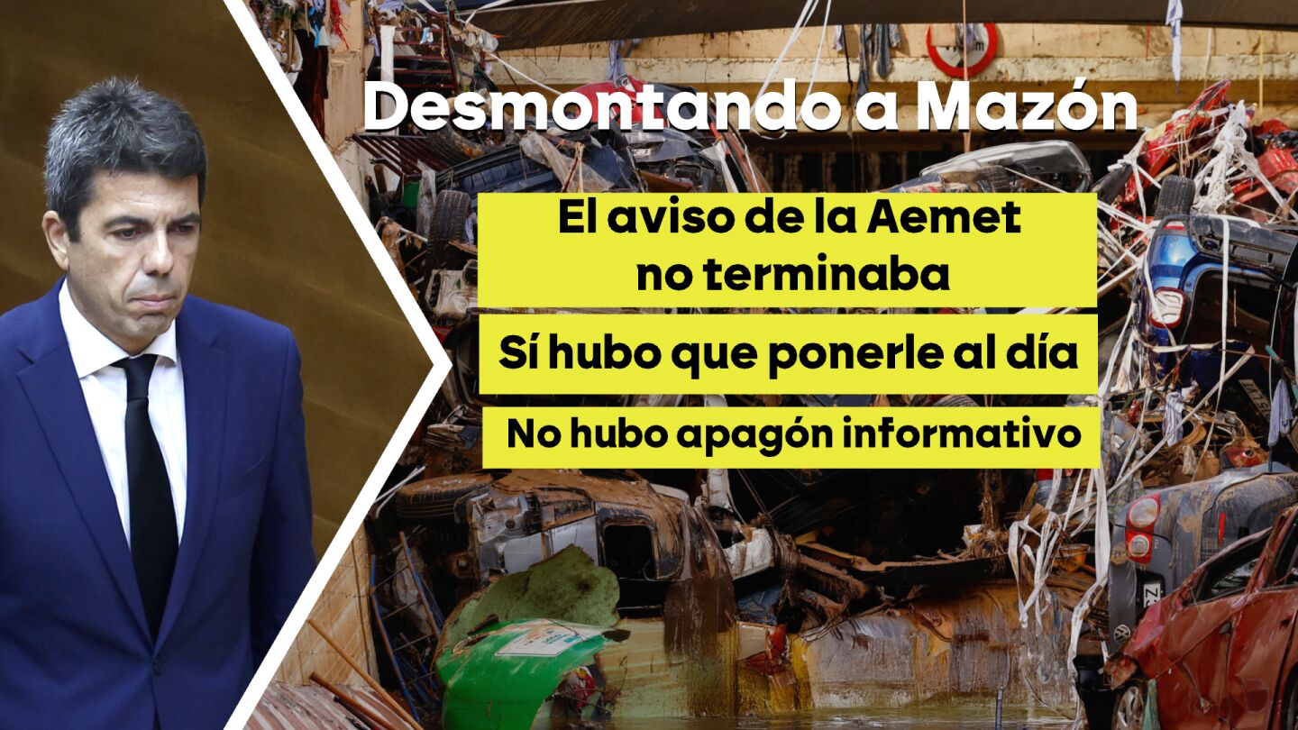 Confuso. Mazón también ha tenido palabras para descargar responsabilidad en la Agencia Estatal de Meteorología (AEMET). Así, el president de la Generalitat se ha escudado en que la AEMET decía que a las 18 de la tarde se acababa el aviso rojo y que por eso él aseguró esa mañana que el peligro pasaría. Pero en este caso hay muchos matices: la AEMET sí tenía activo el aviso rojo hasta las 18:00 horas, pero estos avisos se van actualizando a lo largo del día, es decir, que pueden cambiar. Y, de hecho, cambiaron: a las 17:54 se alargó esa situación. Pero pongamos que hubiera terminado a esa hora: del aviso rojo se hubiera pasado a uno naranja, que también implica un "riesgo importante" y exige que se tomen precauciones.