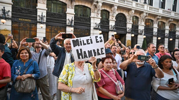 Por un lado, varios colectivos argentinos, convocados por Argentinxs en Movimiento y Argentina Soberana Madrid, se han concentrado para "repudiar" la visita del presidente. Durante la convocatoria, en la que se han podido escuchar consignas como "Milei basura, vos sos la dictadura" o "Ayuso dimisión", se han vivido varios momentos de tensión, ya que, al inicio de la misma, un manifestante a favor del presidente argentino se ha acercado a los concentrados gritando "Viva la libertad, carajo", lo que ha provocado un cruce de insultos.