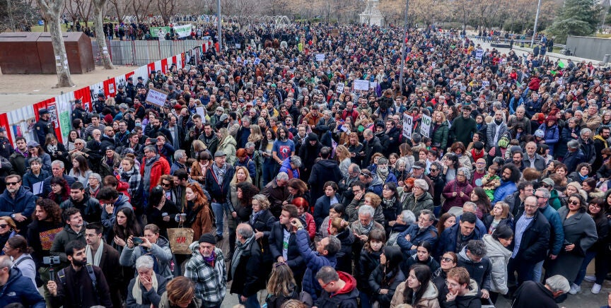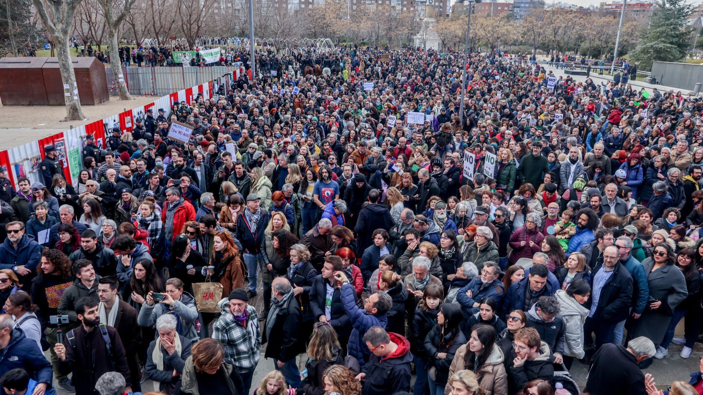 Miles de personas se han concentrado este sábado en Madrid Río, en la capital, en defensa de los árboles amenazados por las obras de la línea 11 de Metro. Muchos de ellos han golpeado, para que se les escuche, las vallas con las que han cercado la arboleda que tendrá que ser talada ahora que el Gobierno de Isabel Díaz Ayuso ha decidido cambiar la ubicación de las estaciones que ampliarán esta línea.