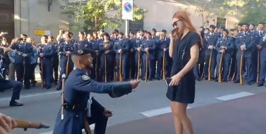 Se trata de una pedida de mano que ha tenido lugar minutos unos minutos antes de que diera comienzo el desfile militar. Las imágenes han sido captadas por el perfil oficial del Estado Mayor de la Defensa, que no ha dudado en compartirlas en su cuenta de Twitter. Como se puede ver en el vídeo de portada un militar del Ejército del Aire ha empezado a realizar unos pasos delante de todos sus compañeros y de su novia, quien grababa atentamente con el móvil.