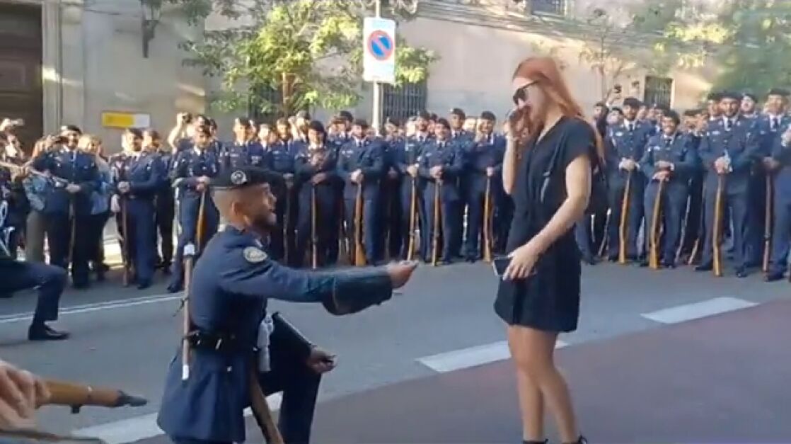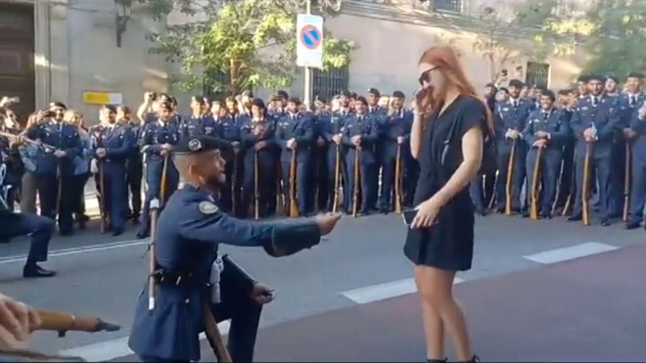 Uno de sus compañeros se ha colocado próximo a ella para acercarla disimuladamente a su novio. Entonces él se ha arrodillado y le ha sacado el anillo. Al instante, sus compañeros han empezado a festejar el momento con gritos. "Di que sí", expresaban emocionados junto a un gran grupo de viandantes, como se puede ver en el vídeo cedido por la EMAD a laSexta.
