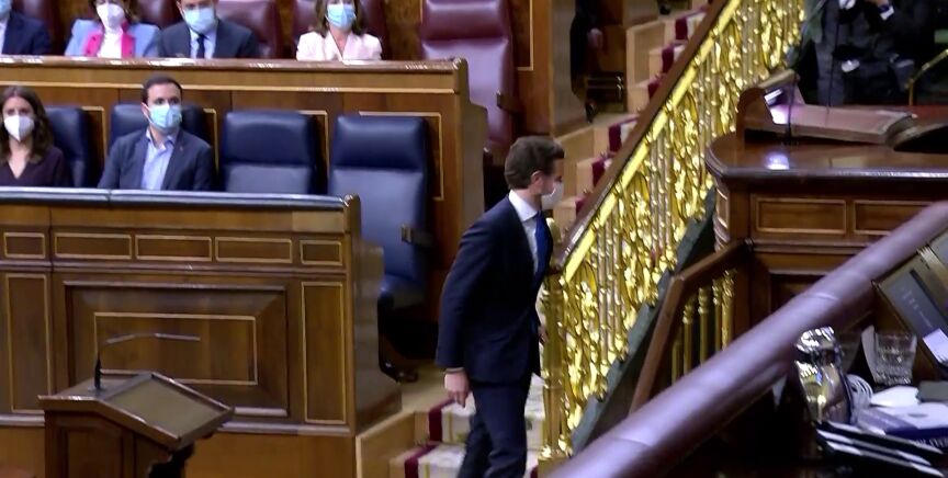 Tras su intervención en el Congreso este miércoles, y tras escuchar la respuesta de Sánchez, Casado se ha levantado del escaño y ha abandonado el hemiciclo, seguido de algunos diputados. Puedes ver el momento en este vídeo.