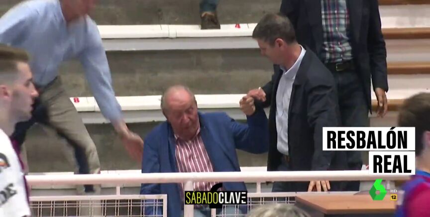El rey emérito trataba de apoyarse en un acompañante con la mano izquierda mientras con la derecha se agarraba de su muleta cuando sufría un resbalón de su asiento. Una imagen que han captado las cámaras de laSexta y que se puede ver en el vídeo principal de esta noticia.