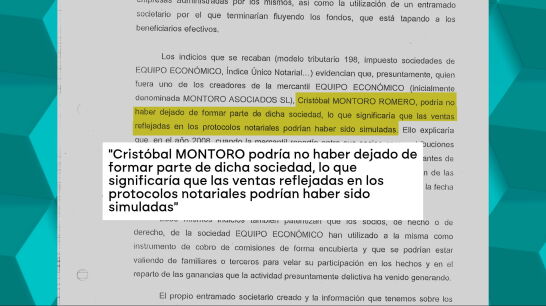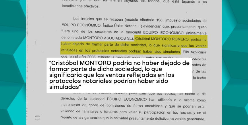 En base a esta documentación, y otra incluida en el sumario, se concluye que Montoro "podría no haber dejado de formar parte de dicha sociedad, lo que significaría que las ventas reflejadas en los protocolos notariales podrían haber sido simuladas". Algo que explicaría que el "valor de transmisión de las acciones" fuera "el valor nominal de la misma, es decir, el mismo precio que tenían en la fecha de constitución, sin tener en cuenta el valor real de la compañía".