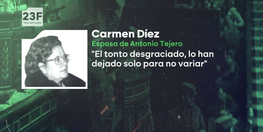 Carmen Díez Pereira, esposa del teniente coronel Antonio Tejero, expresó su frustración al sentirse abandonada durante el intento de golpe de Estado del 23F, según revelan conversaciones desclasificadas. Carmen intentaba comunicarse con su esposo, pero temía que él pensara que la habían forzado a hablar. Lamentaba que a Tejero lo hubieran engañado, a pesar de su dedicación a la patria. En una conversación con Fernando Caro, comandante de la Guardia Civil en Málaga, Carmen expresó su temor de que su esposo fuera asesinado, afirmando que lo habían dejado "tirado como una colilla".