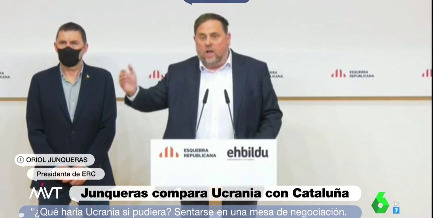 Para Junqueras, "el problema de la mesa de negociación, ¿es que los ucranianos no quieren sentarse? ¿O que hay una agresión exterior por parte de un estado que quiere imponerse y está condicionado por sus tentaciones autoritarias internas?". "Pues en nuestro caso, tres cuartos de lo mismo", ha añadido en alusión a Cataluña. "¿Cuál debe ser nuestra voluntad? La defensa de la mesa de negociación. Y si el Estado no puede llevar ninguna propuesta concreta alternativa, es un déficit del Gobierno, que debería ser capaz de trasladar una propuesta concreta al conjunto de la sociedad catalana y de España".
