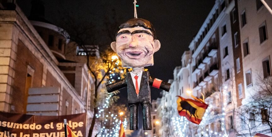 Durante el acto, se destapó un muñeco con la imagen de Pedro Sánchez que terminó en el suelo tras recibir latigazos, puñetazos y patadas en mitad de un ambiente festivo, con banderas de España y una pancarta que en la que se leía "Pedro Sánchez a prisión".