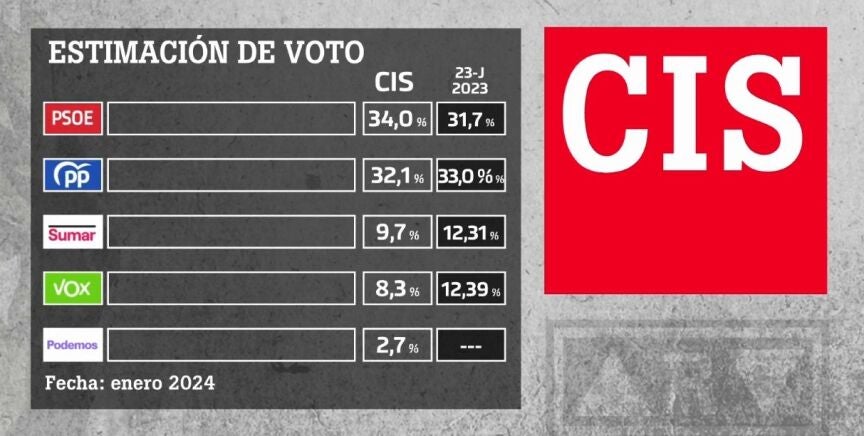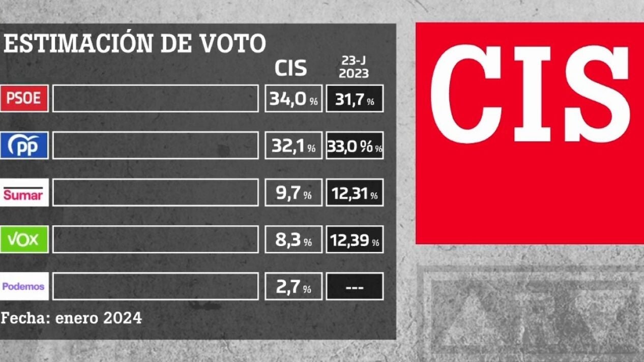 La anterior encuesta, dada a conocer en diciembre, volvió a situar en cabeza al PP, por segundo mes consecutivo, con una estimación de voto del 33,2%, pero su ventaja sobre el PSOE bajó hasta los 1,4 puntos, ya que los 'populares' perdieron siete décimas en un mes y los socialistas marcaron un 31,8% tras subir medio punto con relación al CIS de noviembre, hecho en plenas negociaciones de la amnistía.