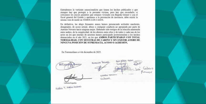Así, deslegitiman el testimonio de la denunciante, explicando que ellas nunca vieron nada sospechoso, y describen al que fuera líder de los socialistas en Torremolinos como una persona "respetuosa" con todas ellas, como si eso fuera excluyente de lo que la denunciante pudo haber vivido. Añaden, incluso, que Navarro está sufriendo un "juicio mediático injusto", que comparan con el que, dicen, ha sufrido Begoña Gómez o el fiscal general.