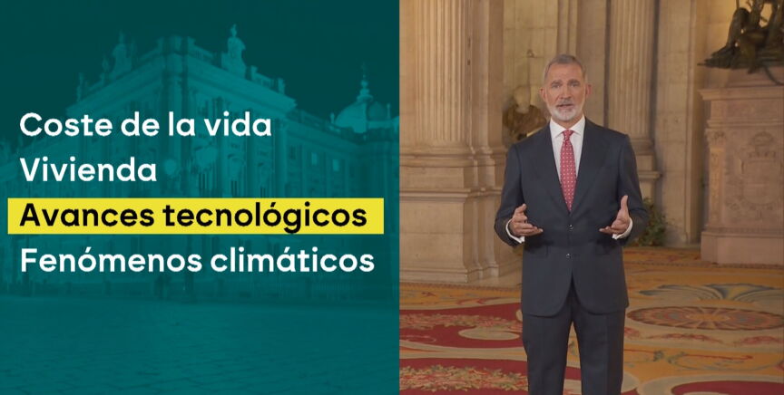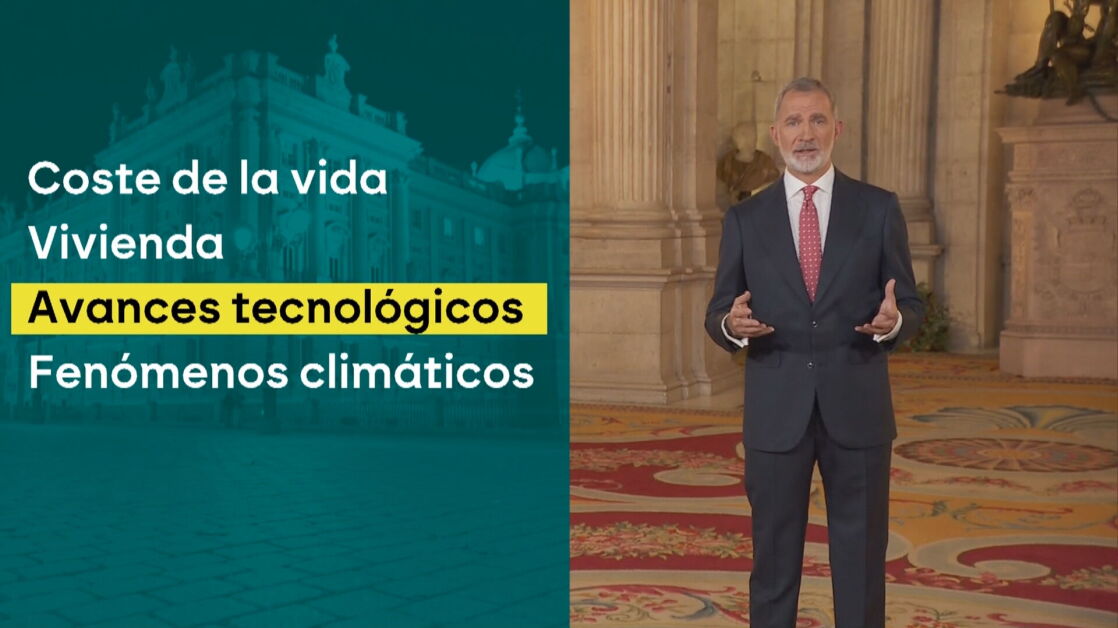 En concreto, el rey ha afirmado la noche de este miércoles -con la novedad de que lo ha hecho de pie y en el Palacio de Oriente- que "vivimos tiempos ciertamente exigentes". "Muchos ciudadanos sienten que el aumento del coste de la vida limita sus opciones de progreso; que el acceso a la vivienda es un obstáculo para los proyectos de tantos jóvenes; que la velocidad de los avances tecnológicos genera incertidumbre laboral; o que los fenómenos climáticos son un condicionante cada vez mayor y en ocasiones trágico", ha afirmado.