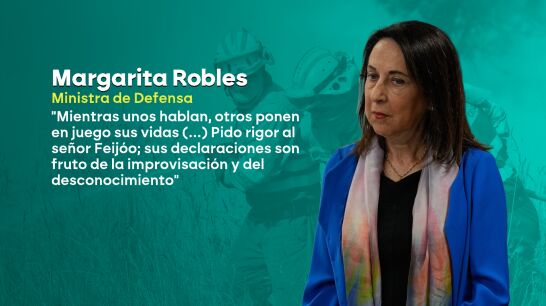 Robles ha criticado las últimas declaraciones del líder del PP, Alberto Núñez Feijóo, que ha pedido desplegar al Ejército bajo un mando autonómico. La ministra ha pedido "rigor" a Feijóo, cuyas declaraciones nacen -dice- de "la improvisación y del desconocimiento".