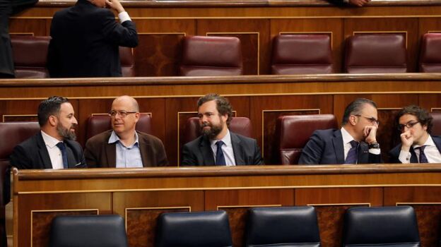 Santiago Abascal y el resto de diputados de Vox se sientan en la bancada que habitualmente ocupa el PSOE