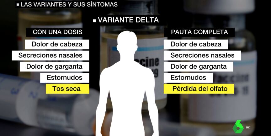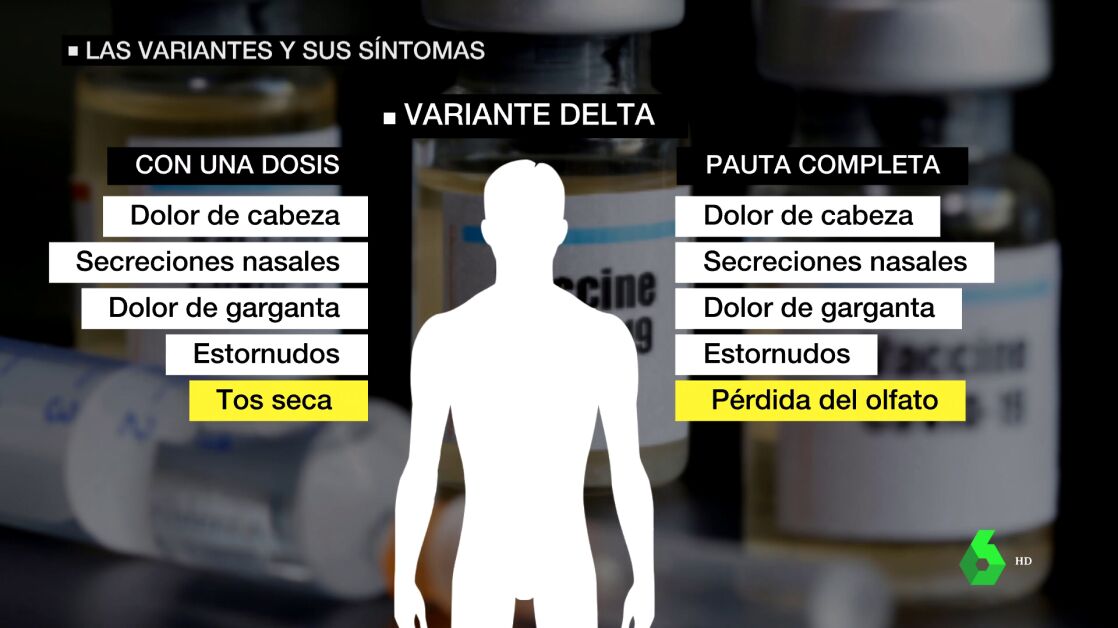 La variante delta se ha convertido ya en la predominante en España, y un estudio revela que sus síntomas no son los mismos si estamos vacunados con una dosis o con la pauta completa. La pérdida de olfato y la tos varían en función del número de pinchazos recibidos. Para conocer más detalles sobre esta cuestión, desde laSexta hemos recoger el testimonio de Olga García, que se contagió con esta cepa casi un mes después de tener la pauta completa.