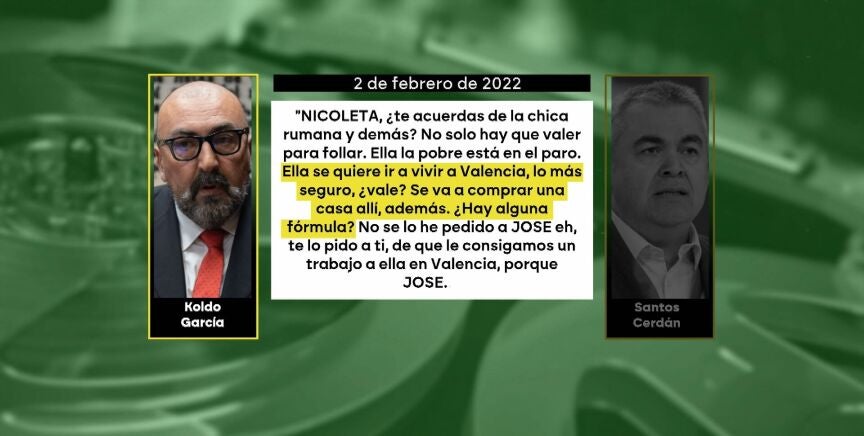 "¿Te acuerdas de la chica rumana y demás? No solo hay que valer para follar. Ella, la pobre, está en el paro", le escribe Koldo a Cerdán para pedirle que le busque trabajo en una empresa pública.