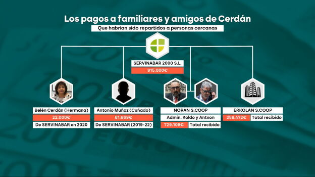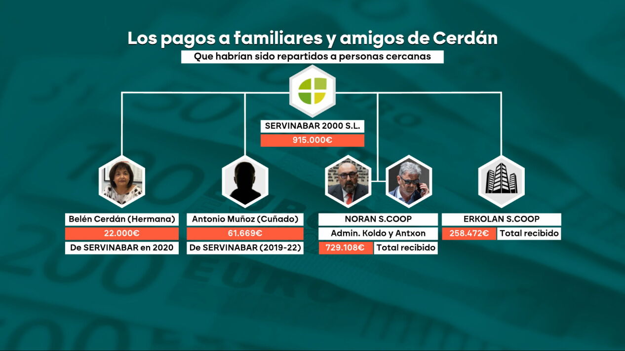 Las investigaciones policiales y judiciales señalan que Servinabar, una constructora vinculada a Santos Cerdán, exsecretario de Organización del PSOE, habría funcionado como una agencia de colocación para familiares y amigos del político, repartiendo casi un millón de euros. Antonio Muñoz, cuñado de Cerdán, recibió más de 61.000 euros en tres años, mientras que Belén Cerdán, hermana del exdirigente, cobró 22.000 euros en 2020 por trabajos de contabilidad. Posteriormente, trabajó para Erkolan, cuyos ingresos aumentaron en 250.000 euros. Erkolan compartía sede con Noran, una cooperativa que presuntamente transfería beneficios, moviendo más de 700.000 euros entre 2016 y 2024.