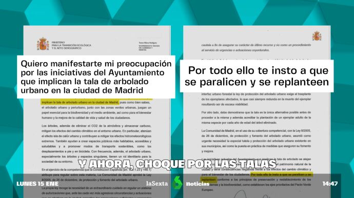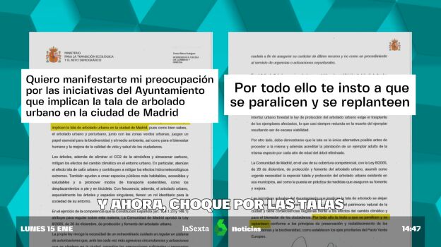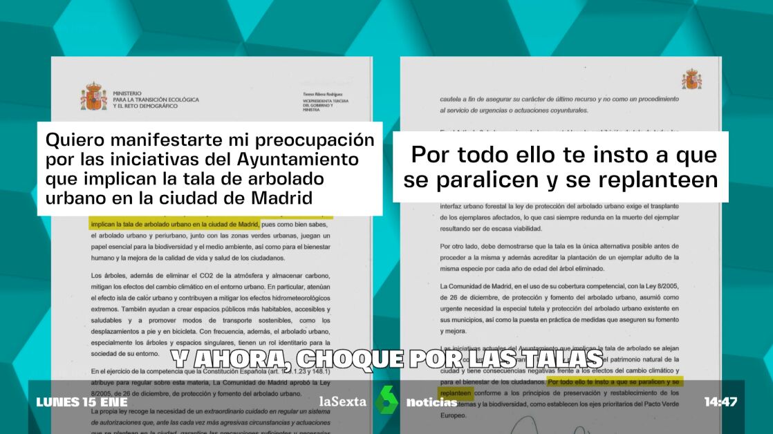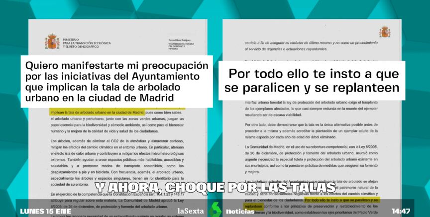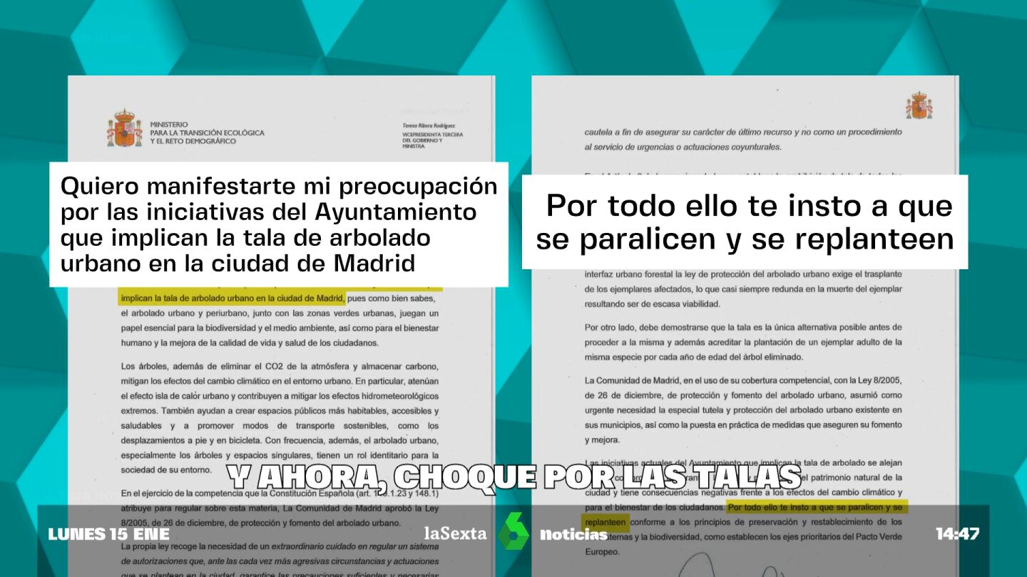 Ahora mismo, en la capital de España se están arrancando árboles plantados hace décadas y dejando sin sombra muchas zonas del centro. laSexta ha tenido acceso a la carta enviada por Ribera a Almeida, en la que insta al alcalde a replantearse el proyecto.