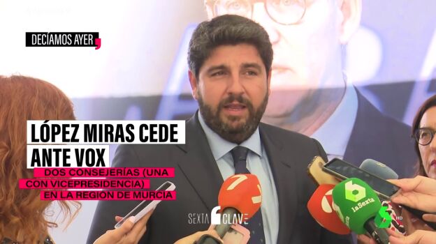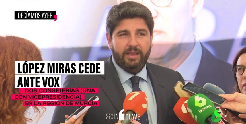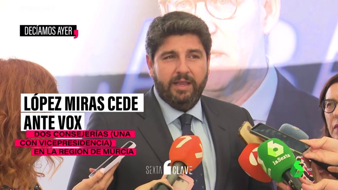 El Partido Popular lo ha vuelto hacer. Ha pasado de decir que no pactaría con Vox a pactar con Vox. Fernando López Miras, presidente en funciones de Murcia y actual candidato a la presidencia, ha cedido y volverá a ser presidente de la Región de Murcia con Vox en su Gobierno. La ultraderecha obtendrá dos carteras, la Consejería de Fomento y la de Seguridad, Interior y Emergencias, siendo esta última con rango de vicepresidencia. López Miras evita así, la repetición electoral.... pero no la hemeroteca.