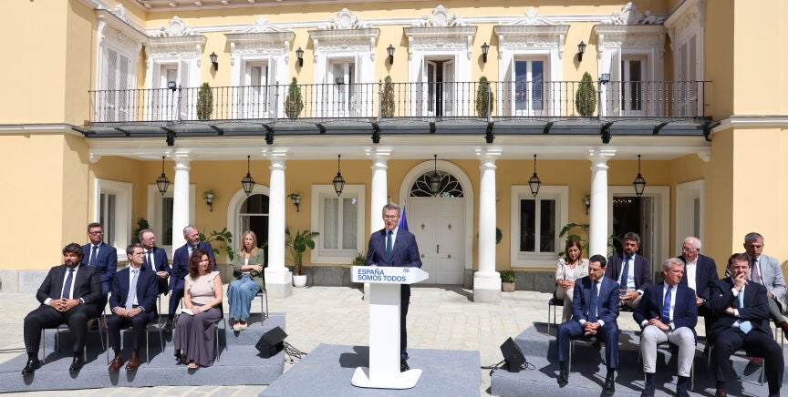 El viernes, tras una cumbre albergada en un escenario muy similar al Palacio de La Moncloa, el líder del PP, Alberto Núñez Feijóo, desglosó en una comparecencia sin preguntas el contenido del manifiesto suscrito por sus barones territoriales, en el que renuncian a la bilateralidad con el Ejecutivo central y reclaman un nuevo modelo de financiación desde la "multilateralidad".