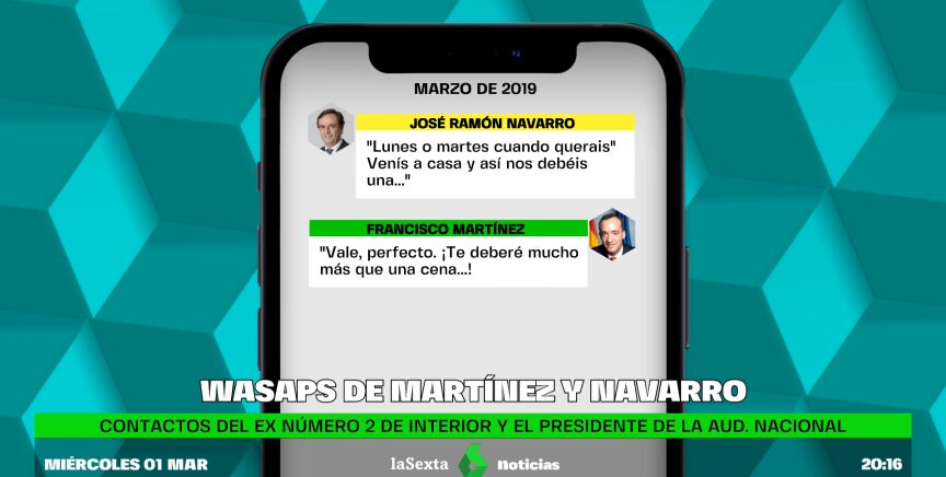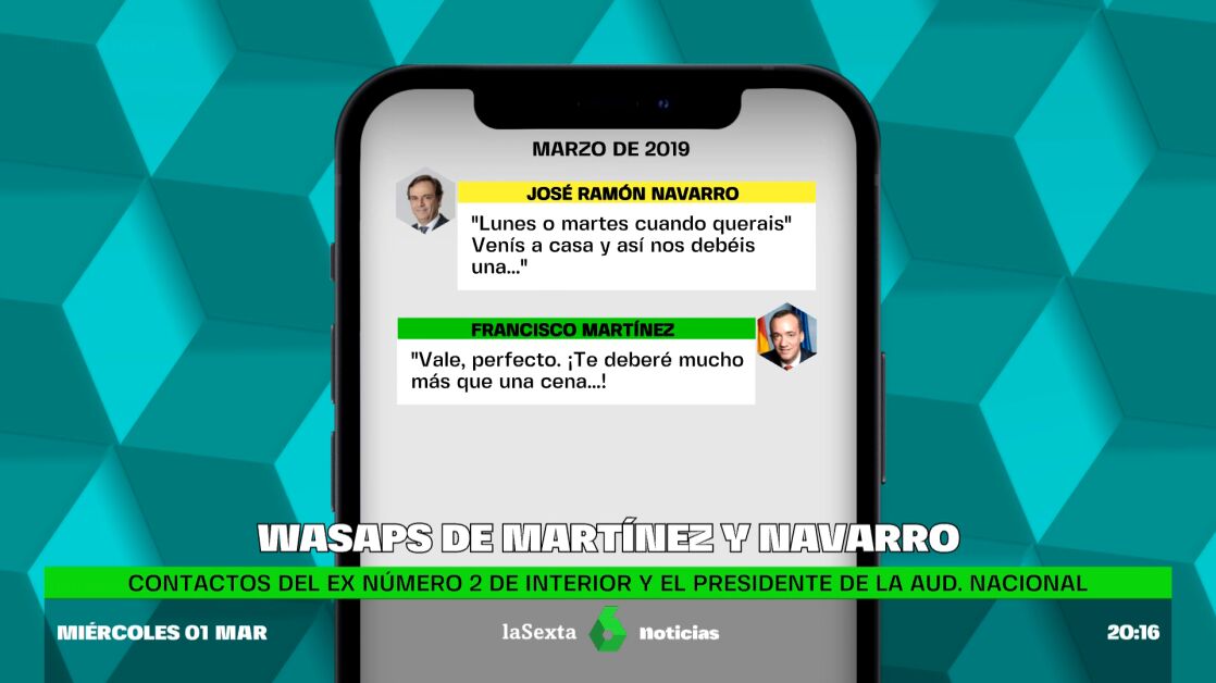 laSexta accede a los mensajes que se intercambiaron el que fuera número dos del Ministerio del Interior y José Ramón Navarro en marzo de 2019. Martínez llegó a ofrecerle compensarle con "una cena con Vega Sicilia".