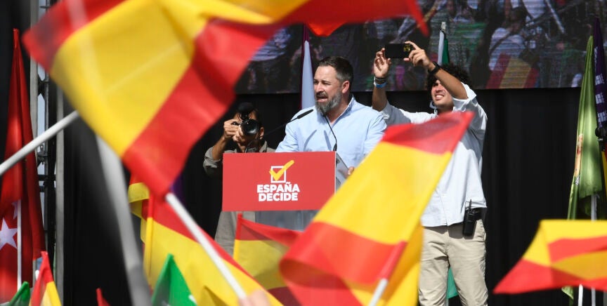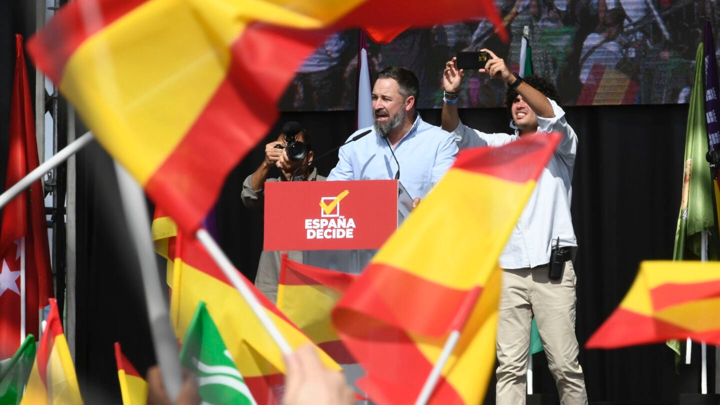 Durante su intervención, el líder de Vox, Santiago Abascal, ha sugerido que los españoles puedan votar acerca los sindicatos, el "suicidio climático" o para declarar ilegales aquellos partidos que "atacan España".
