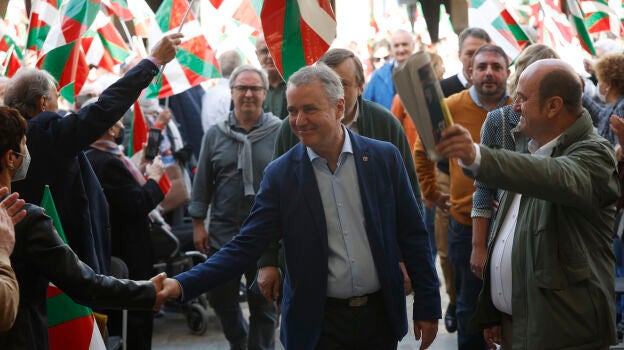 Urkullu ha participado este soleado domingo en la Plaza Nueva de Bilbao en la multitudinaria celebración del PNV del Aberri Eguna (Día de la patria vasca), en un acto político en el que también ha intervenido el presidente del EBB del PNV, Andoni Ortuzar, encabezando la delegación de los principales dirigente del partido.