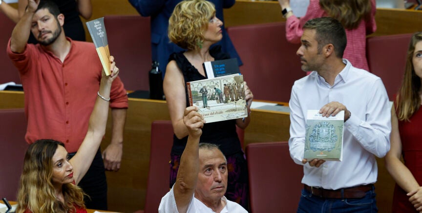 Al finalizar la votación, los diputados del grupo socialista ha mostrado una pancarta en la que se podía leer "veritat, justícia, reparació" (verdad, justicia, reparación), mientras que los parlamentarios de Compromís han enseñado libros relacionados con la memoria democrática.