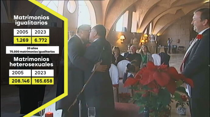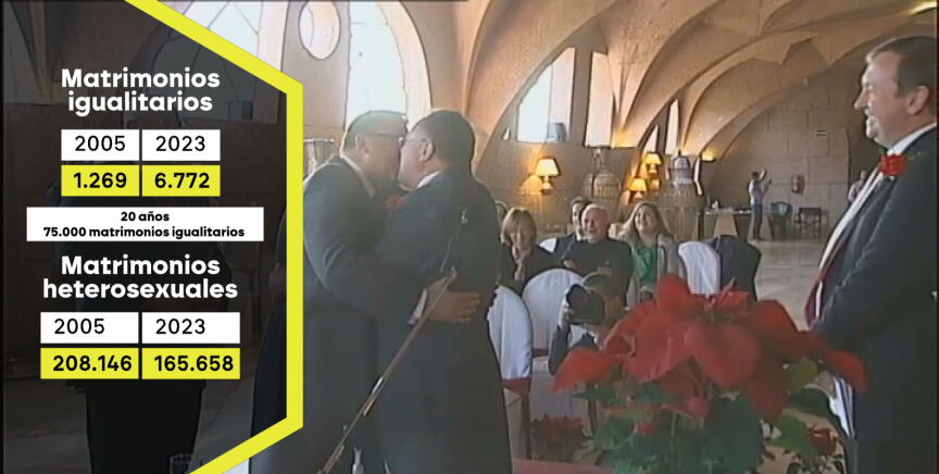 Hoy, el 78% de la población española apoya el matrimonio igualitario, aunque este respaldo ha descendido cuatro puntos en los últimos dos años. Sin embargo, los datos muestran una realidad positiva: las bodas LGTBIQ+ han aumentado notablemente. En 2023 se celebraron 6.700 enlaces, cinco veces más que en 2005. En total, 75.000 parejas del mismo sexo se han casado en estos 20 años, mientras que los matrimonios entre hombres y mujeres han descendido un 20%.