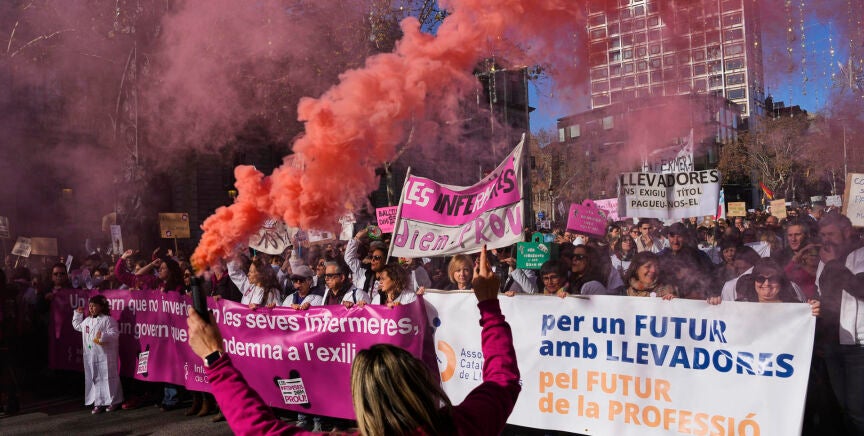 Unas 3.500 enfermeras reclaman mejoras laborales en las calles de Barcelona tras un mes de huelga en Cataluña