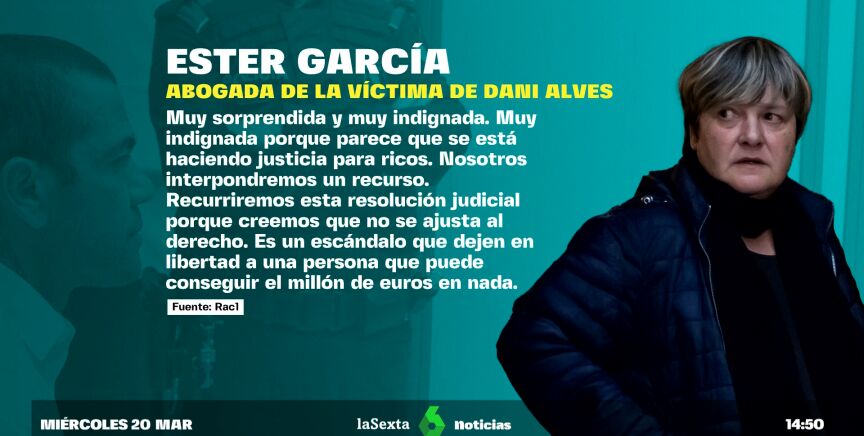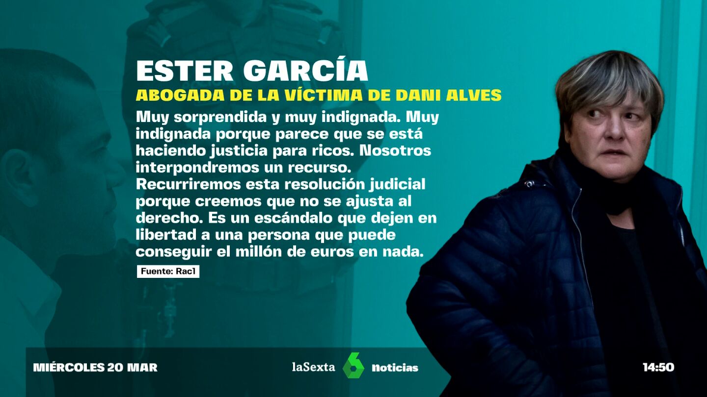 Dani Alves saldrá en libertad si paga un millón de euros de fianza hasta que haya sentencia firme, pese a haber sido condenado por agresión sexual. Una decisión judicial ante la que la abogada de la víctima ha trasladado su indignación y ha avanzado que recurrirá. Lo ha hecho en una entrevista en 'Rac 1', en la que la letrada Ester García ha dicho estar "muy sorprendida y muy indignada" con esta resolución y ha denunciado que "parece que se está haciendo justicia para ricos".