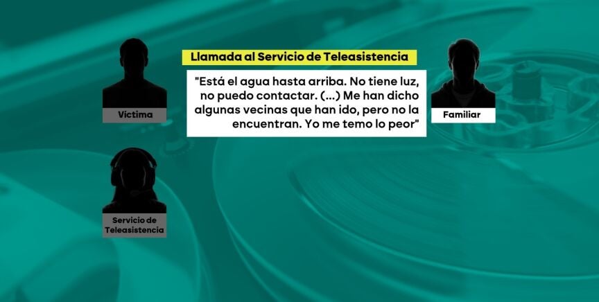 Tras al menos seis intentos de contactar con el 112, el técnico de teleasistencia finalmente lo logra: "Tenemos una usuaria en Utiel que se le ha inundado la casa, tiene 90 años, y no pueden… no les dejan acceder a los hijos ni pueden contactar con ella. Necesitamos saber si la Policía o los Bomberos la han sacado del domicilio".