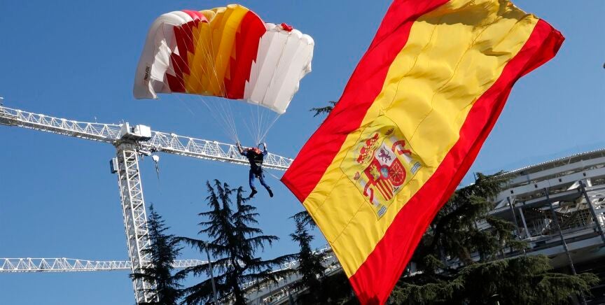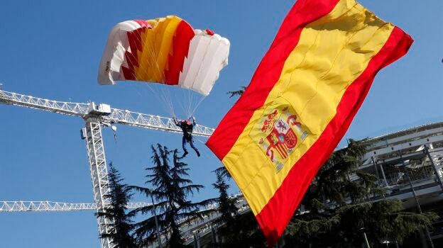 Así vivió el paracaidista del 12 de octubre el enredo de la bandera de España: "Pensé en la que podría haber liado si llego al suelo con ella enganchada"