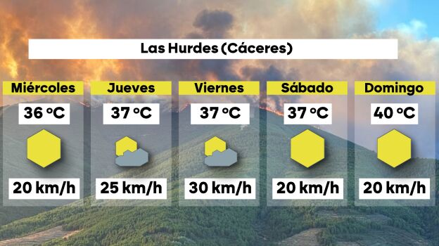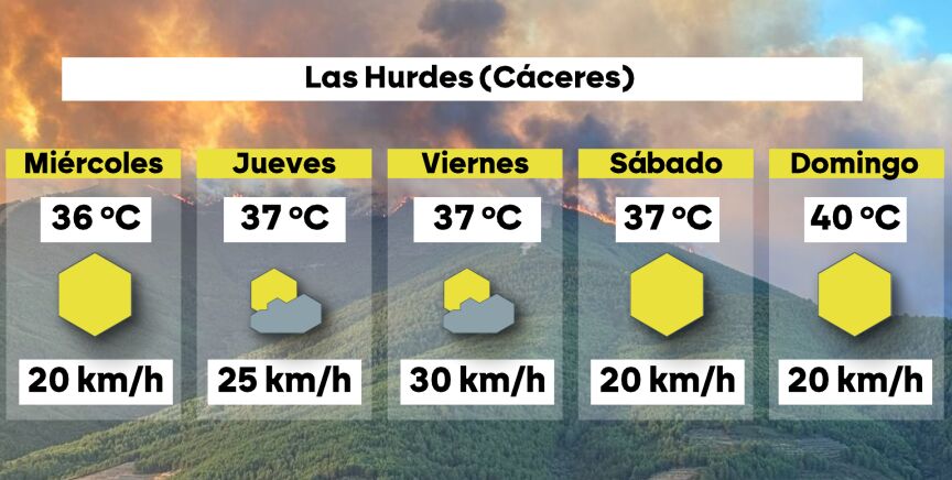 En cuanto al incendio de Las Hurdes, el calor será más intenso todavía. Este jueves 31 de julio la temperatura ya ascenderá a los 37º C y el domingo se espera que alcance los 40º C.