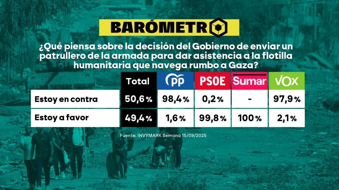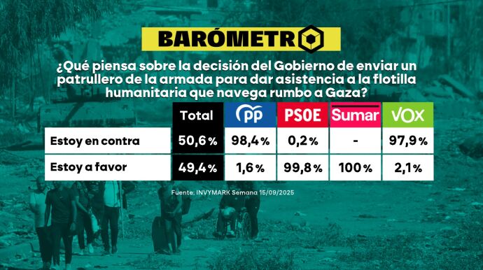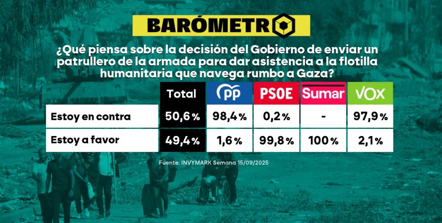 La Sumud Global Flotilla, conocida como la Flotilla de la Libertad, partió hace un mes hacia Gaza para romper el bloqueo israelí y entregar ayuda humanitaria. Miles de personas han protestado contra el abordaje israelí, mientras que España envió el buque 'Furor' para asistir a las embarcaciones, generando un debate. Según un barómetro de laSexta, el 50,6% de los encuestados se opone al envío del patrullero, mientras el 49,4% lo apoya. Los votantes del Partido Popular se muestran mayoritariamente en contra, mientras que los socialistas y Sumar apoyan la decisión. Vox, por su parte, se opone casi unánimemente.