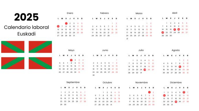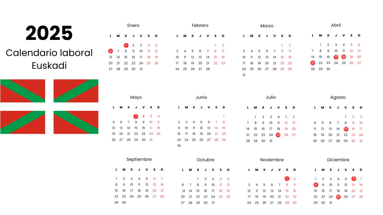El calendario laboral de Euskadi 2025 recoge un total de doce festivos repartidos a lo largo de los doce meses. Si bien, hay meses que no tienen ningún día y algunos que tienen más de dos seguidos.