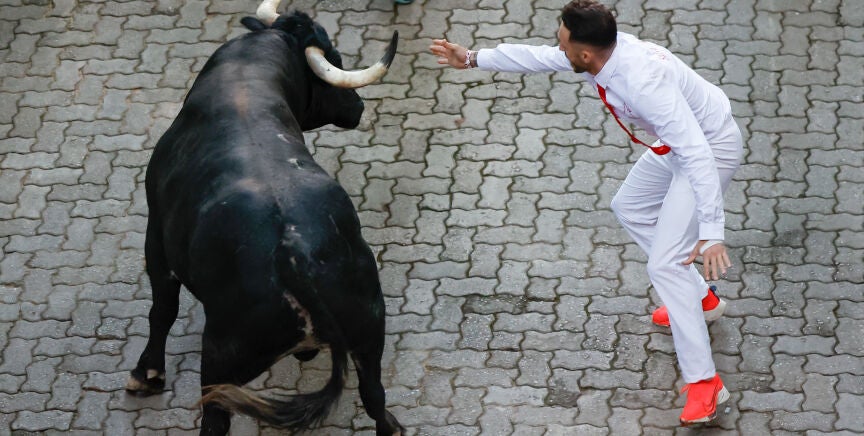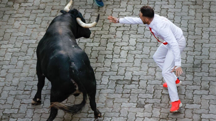 Pero el momento de máxima tensión ha tenido lugar cuando uno de los toros se ha descolgado de la manada: en concreto ha sido Caminante, un 'cebada gago' de 575 kg que se ha quedado solo en la calle Estafeta y que, en solitario y con retraso, ha recorrido los últimos tramos del encierro: Telefónica y el callejón de la plaza.