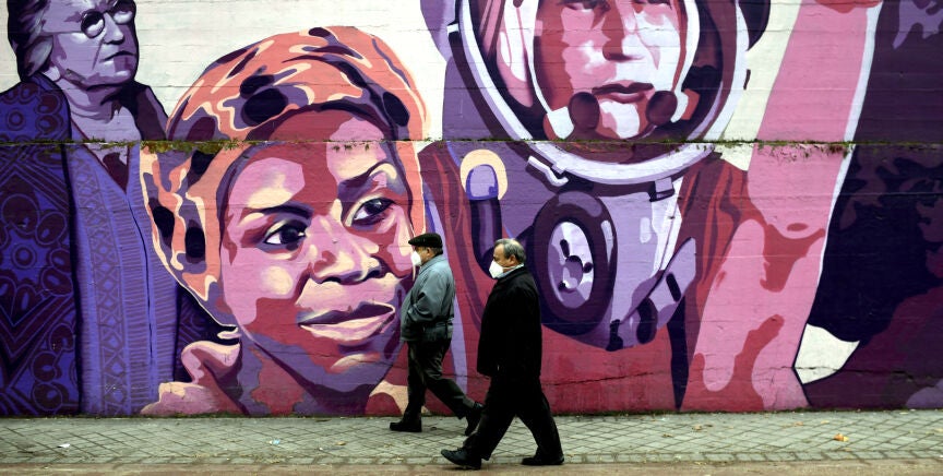 Una mujer camina junto al mural de las mujeres del barrio de Ciudad Lineal en MadridAgencia EFE