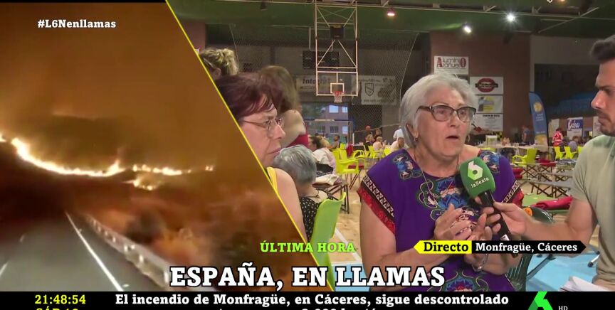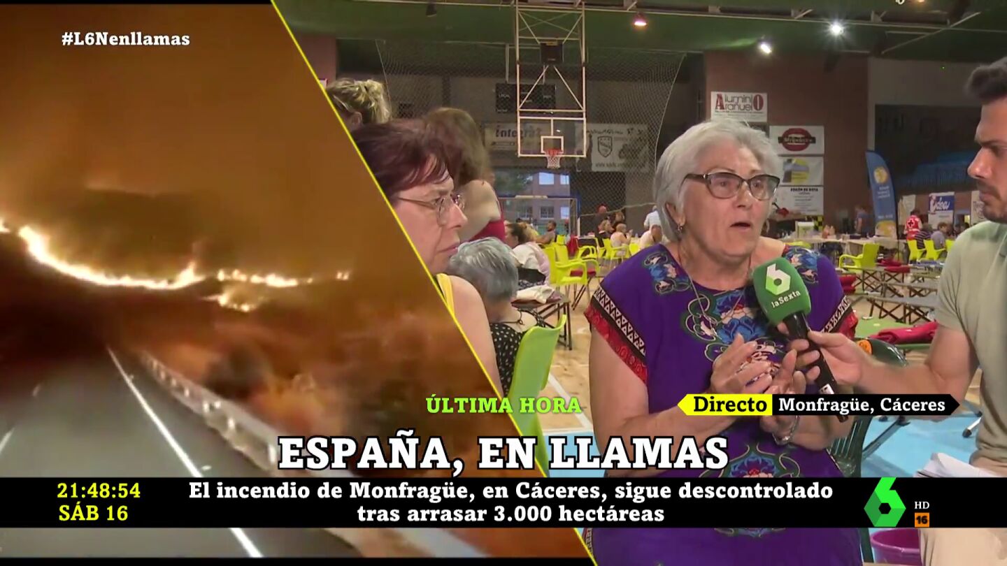 Pilar, una vecina de la localidad cacereña de Romangordo que ha sido evacuada de su hogar debido al incendio, ha relatado en laSexta Noche cómo vivió una situación que "nunca" olvidará y "no le desea a nadie".