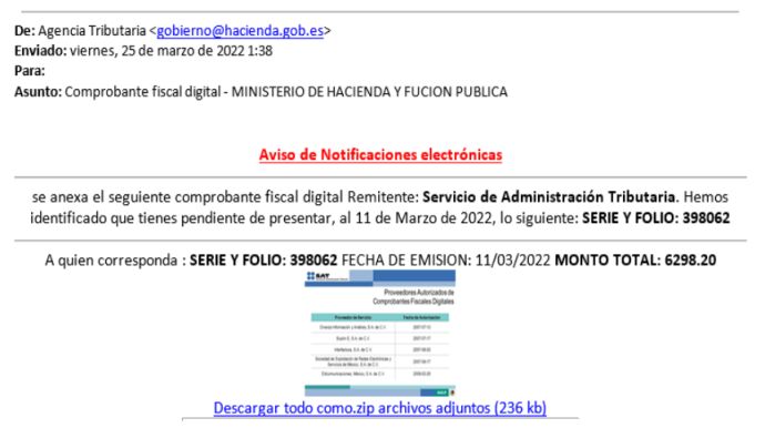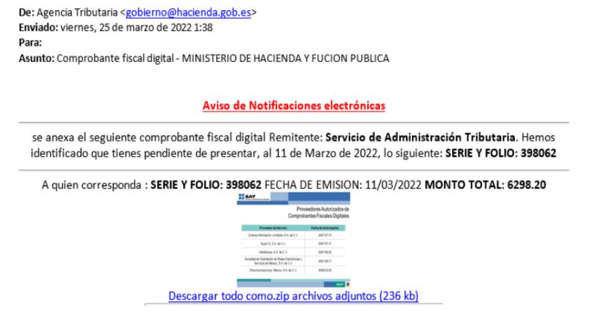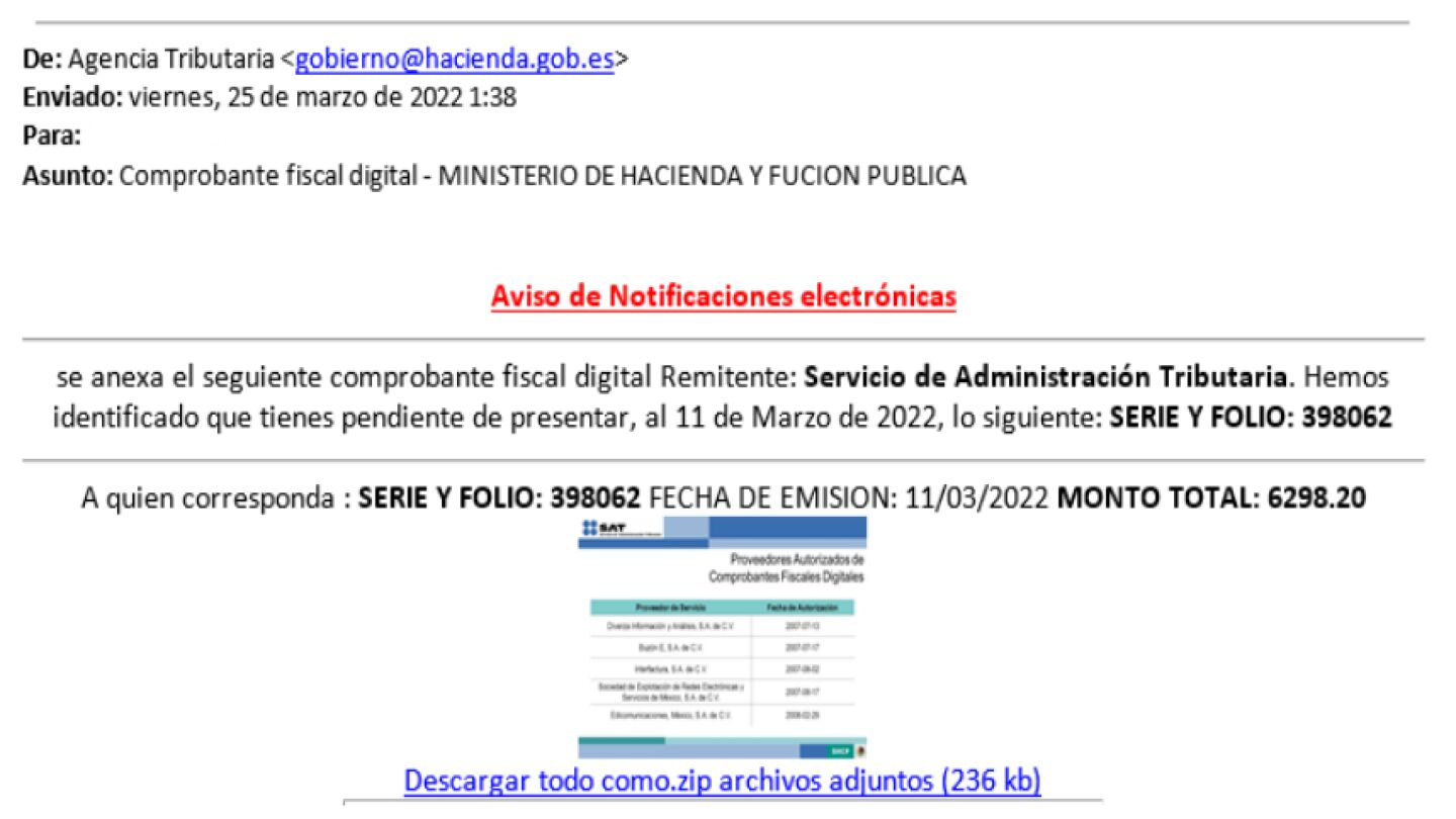 Los estafadores no han querido dejar pasar la oportunidad de engañar a sus víctimas en plena campaña de la declaración de la Renta. Así, las dos entidades oficiales advierten a los contribuyentes de que se ha detectado una campaña de correos electrónicos fraudulentos en los que se suplanta la identidad a la Agencia Tributaria.La OSI explica que estos mails se "envían aparentemente desde un correo electrónico verídico, lo que hace más difícil identificar el fraude·. Además advierten de que tienen como asunto “Comprobante fiscal digital - MINISTERIO DE HACIENDA Y FUCION PUBLICA” o similar. En el interior del mensaje se indica al usuario que tiene pendiente presentar cierta documentación como excusa para que haga clic en un enlace que realmente descarga malware.