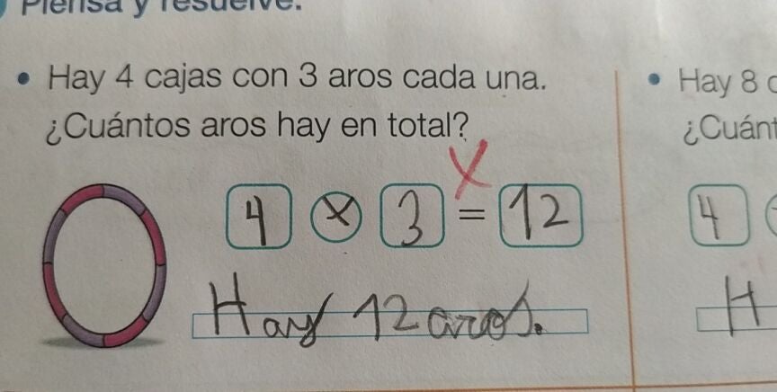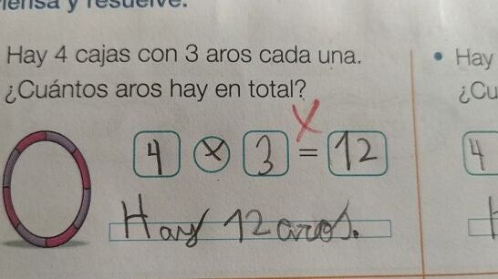 Un ejercicio que ha compartido una madre en Twitter ha generado un interesante debate en la red social. Este es el enunciado de la práctica de la discordia: "Hay cuatro cajas con tres aros cada una. ¿Cuántos aros hay en total?".