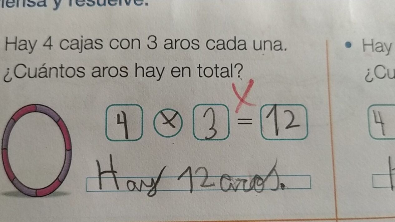 El enunciado del ejercicio es el siguiente: "Hay cuatro cajas con tres aros cada una. ¿Cuántos aros hay en total?". La niña contestó señalando que "4X3=12. Hay 12 aros". Sin embargo, la profesora tachó lo que parece una respuesta correcta como mal. Algunos usuarios de Twitter intentaron explicar a la madre que la norma es contenido por continente, por tanto, tiene que ser 3X4 no lo contrario.