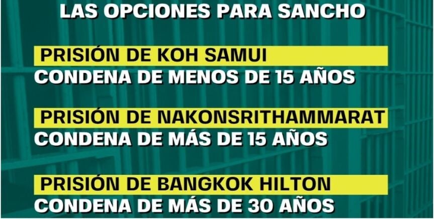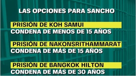 Entre ellos, el más positivo para Sancho sería el de permanecer en la de Koh Samui, puesto que implicaría que la justicia tailandesa le condena menos de 15 años de cárcel, además es de sobra conocido que en este centro penitenciario está totalmente integrado. En el caso de que la sentencia estipule una pena mayor a la quincena de años tendría que trasladarse a la de Nakonsritthammarat. Ubicada en el sur del país asiático, su población carcelaria es superior a la que presenta la actual.