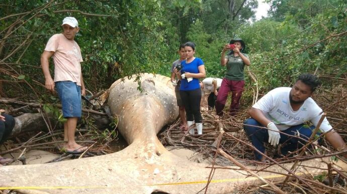 La aparición del cadáver de una ballena jorobada en la selva del Amazonas sigue siendo un misterio para los científicos, que tratan de descifrar cómo pudo llegar hasta allí. Miembros del Instituto Bicho D’agua, una ONG de Brasil, difundió las imágenes por redes sociales.