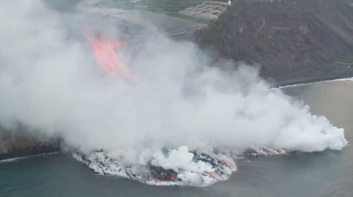 Las imágenes tomadas esta misma mañana muestran la fuerza de la naturaleza después de que esta noche la lava del volcán de La Palma llegara al mar.