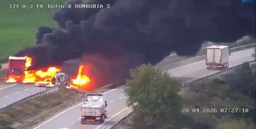 Los detalles El aparatoso accidente, con los dos camiones atravesados en la vía y una gran columna de humo negro, ha provocado el corte total de la A-3. La Guardia Civil ha establecido un paso alternativo a la altura del kilómetro 175.