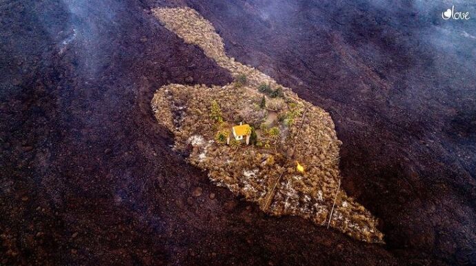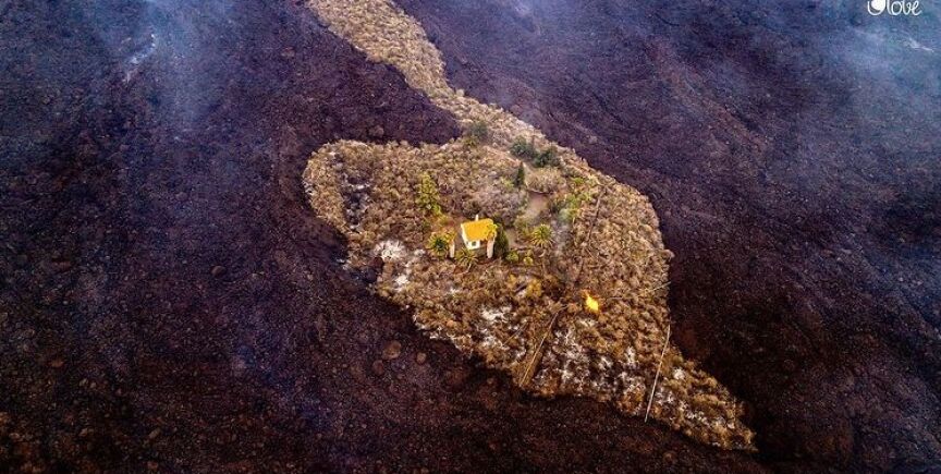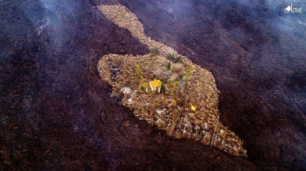 Es el caso de esta instantánea captada por el fotógrafo Alfonso Escalero. En ella aparece una vivienda que se ha 'salvado' de ser engullida por la lava, que la ha rodeado para seguir su camino.