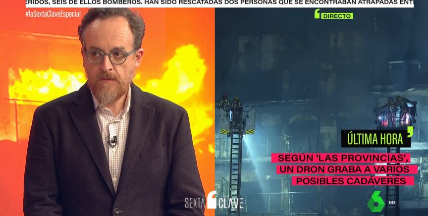 El arquitecto Jon Goitia ha estado este jueves por la noche en el Especial de laSexta Clave con motivo del incendio que ha arrasado con un edificio del barrio del Campanar en Valencia para explicar cómo es posible que las llamas se hayan expandido a tal velocidad. Para el experto, "lo que más encaja" es el poliuretano empleado en los paneles 'sandwich', pero también su colocación.