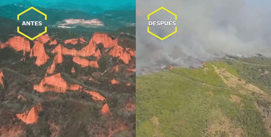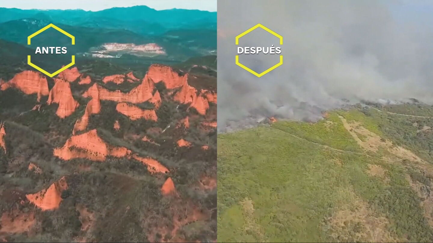 Las llamas arrasan Las Médulas, en León, tal y como se observa en las imágenes sobre estas líneas, en las que también se pueden ver antes de que llegara el fuego. Declaradas Patrimonio de la Humanidad desde 1997 son la mayor mina de oro a cielo abierto de la época romana.