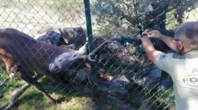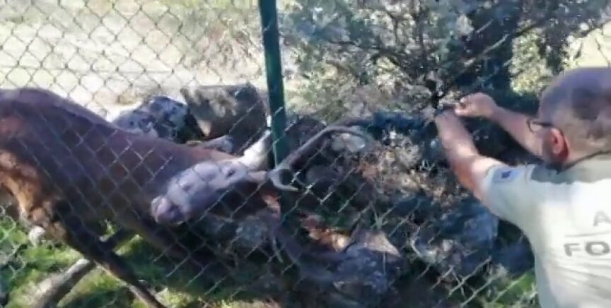 El momento en el que liberan a un ciervo tras quedar atrapado en una alambrada metálica en Hoyo de Manzanares (Madrid)