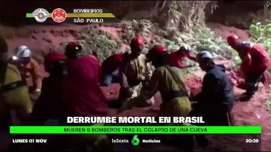 Nueve bomberos murieron soterrados y una persona fue rescatada con vida tras permanecer horas atrapados en el interior de una gruta que se derrumbó este domingo en una ciudad del estado de Sao Paulo, informaron fuentes oficiales. El accidente sucedió de madrugada cuando un grupo con 28 bomberos civiles realizaba un entrenamiento en la gruta Dos Bocas de la ciudad de Altinópolis, localizada a unos 360 kilómetros de la capital paulista, y parte de la caverna se desplomó, dejando una decena de personas atrapadas en su interior.
